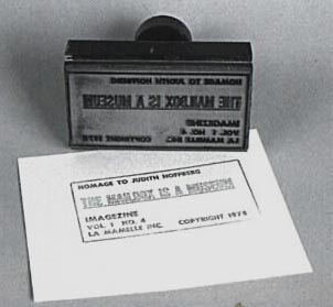 A consistent feature in correspondence artists' promotion of their network identities has been the use of rubber stamps. This appropriation of an official and bureaucratic imprimatur in order to lend legitimacy to network identities is widespread. More generally, artists' adoption of rubber stamps as a part of their work gained momentum from the late 1950s onwards, particularly among the Nouveaux Réalistes and more markedly within Fluxus. Their use divides broadly between the creation of experimental yet traditionally conceived art works and numerous examples which rely upon the replication of texts. It is the latter that predominates in the early years of correspondence art. The preoccupation with texts reflects the conceptual turn that work outside of the mainstream took during the early 1960s. Dispensing with the image, the text becomes the initiator of a mental image as well as the agency through which specific projects, events and instruction pieces were set into motion. Other genres which emerged within this potentially decommodified and multiple based activity include: visual and concrete poetry stamps that examined the construction of words and language and still other stamps created to instruct, protest and authenticate. Later in the 1970s correspondence art expanded the use of image-based rubber stamps.